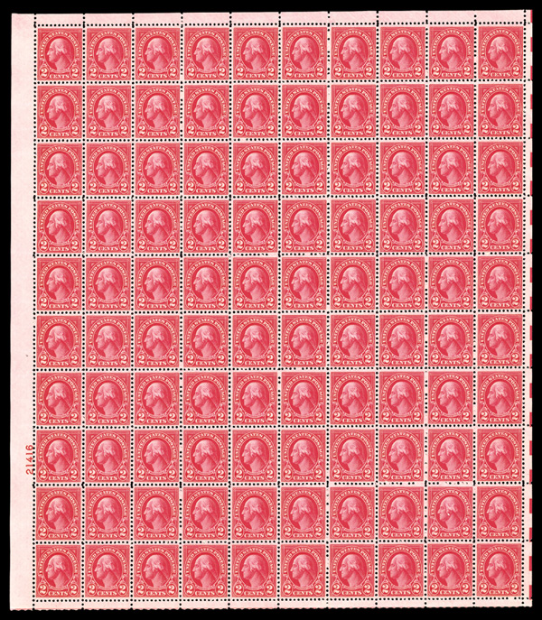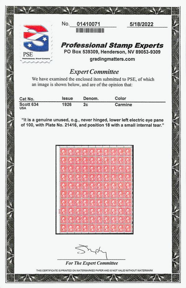 9162 nhbl 634 image1926, 2¢ Washington, type I, rotary press printing (Scott 634), bottom left electric eye full pane of 100 with plate number 21416, o.g., never hinged, Post Office fresh with sound perforations and rich color; position 18 with a small internal tear, Fine to Very Fine, with 2022 P.S.E. certificate.
