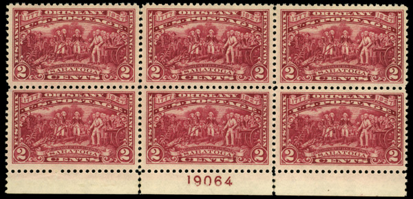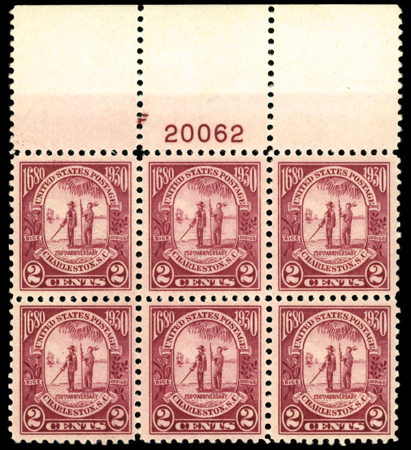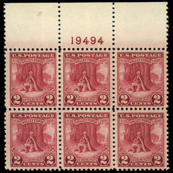 9168 nhbl 645 image1928, 2¢ Valley Forge (Scott 645), top margin plate block of 6, Beautiful deep shade, o.g., never hinged, Very Fine.