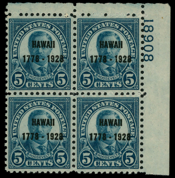 9170 nhbl 648 image1928, 5¢ Hawaii (Scott 648), top right plate block of 6, Crisp with strong contrast, o.g., never hinged, Fine to Very Fine.