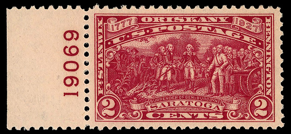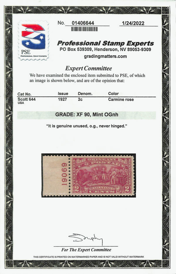 9166 nh 644 image1927, 2¢ Burgoyne (Scott 644), left margin single with plate number, Crisp lines, deep tone, o.g., never hinged, Extremely Fine, with 2022 P.S.E. certificate graded XF 90.
