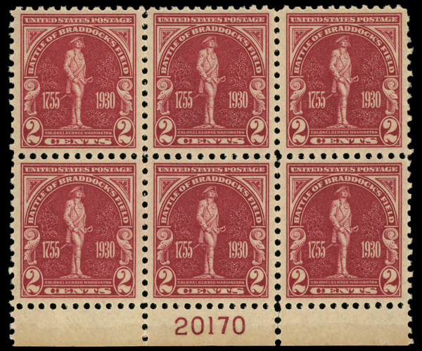 9181 nhbl 688 image1930, 2¢ Battle of Braddock's Field (Scott 688), plate block of 6, o.g., never hinged (gum skip), Extremely Fine.