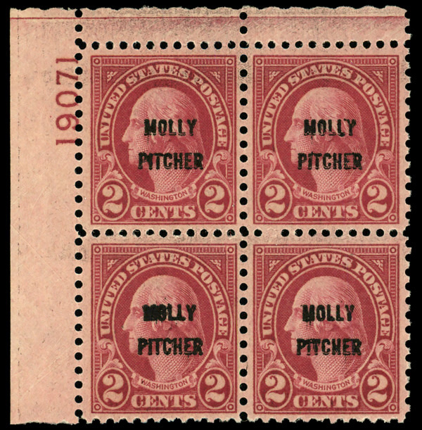 9169 nhbl 646 image1928, 2¢ Molly Pitcher (Scott 646), plate block of 4, o.g., never hinged, Extremely Fine.