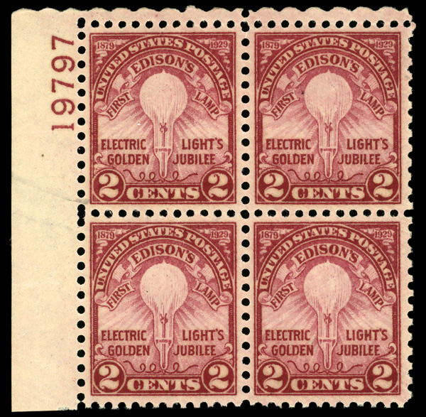 9173 nhbl 655 image1929, 2¢ Edison, rotary press printing (Scott 655), plate block of 4, o.g., never hinged, Extremely Fine.