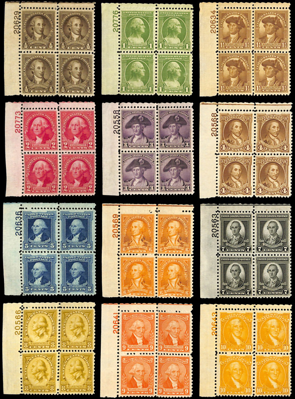 9186 nhbl 704-715 image1932, Washington Bicentennial complete (Scott 704-715), set of 12, plate blocks of 4, o.g., never hinged (1c disturbed o.g.), Very Fine to Extremely Fine.
