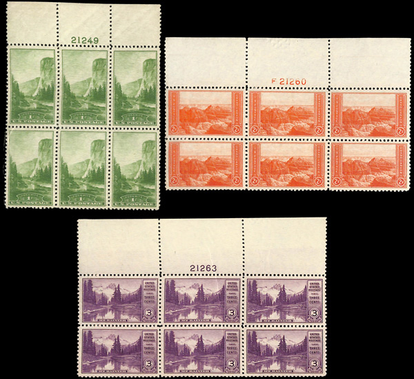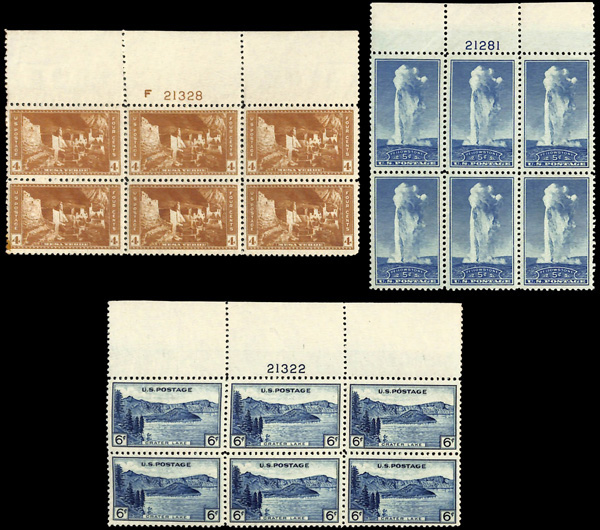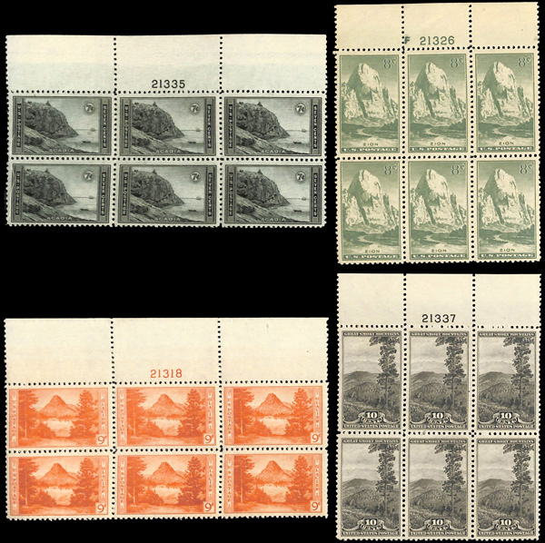9191 nhbl 740-749 image1934, National Parks complete, perforated (Scott 740-749), plate blocks of 6, o.g., never hinged (1c & 2c gum skips), Extremely Fine.