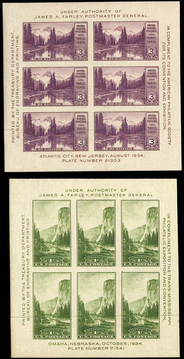 9192 nh 750-751 image1934, Philatelic Exhibitions, souvenir sheets (Scott 750-751), o.g., never hinged, Extremely Fine.