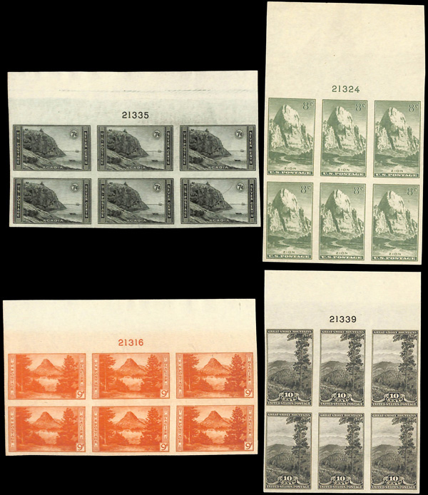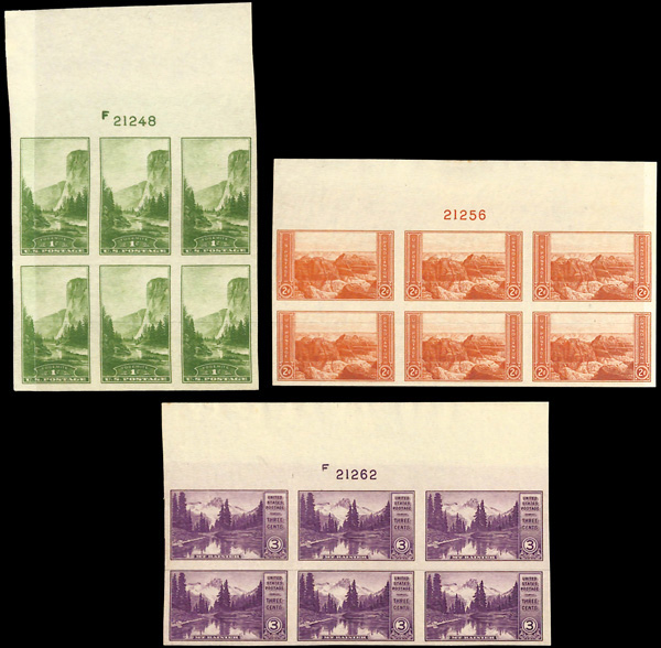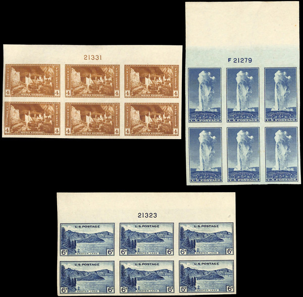 9193 ngbl 756-765 image1935, National Parks, imperf., 1¢ to 10¢ complete (Scott 756-765), set of 10, plate blocks of 6, without gum as issued, Very Fine to Extremely Fine.