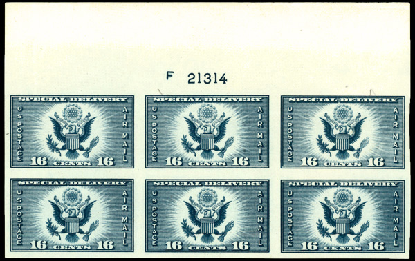 9195 ngbl 771 image1935, 16¢ Airmail Special Delivery, imperf. (Scott 771), plate block of 6, without gum as issued, Extremely Fine.
