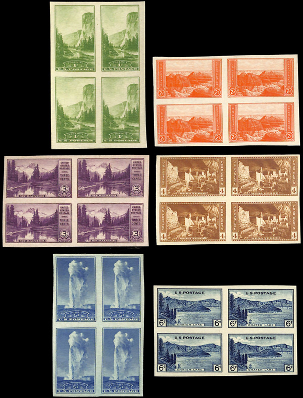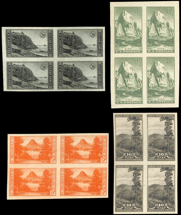 9194 ngbl 756-765 image1935, National Parks, imperf., 1¢ to 10¢ complete (Scott 756-765), set of 10, blocks of 4, without gum as issued, Very Fine to Extremely Fine.