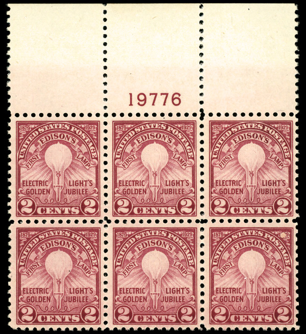 9172 nhbl 654 image1929, 2¢ Edison, flat plate printing (Scott 654), plate block of 6, o.g., never hinged, Very Fine to Extremely Fine.