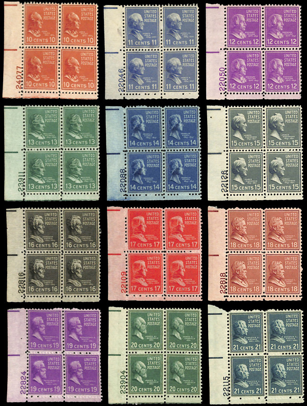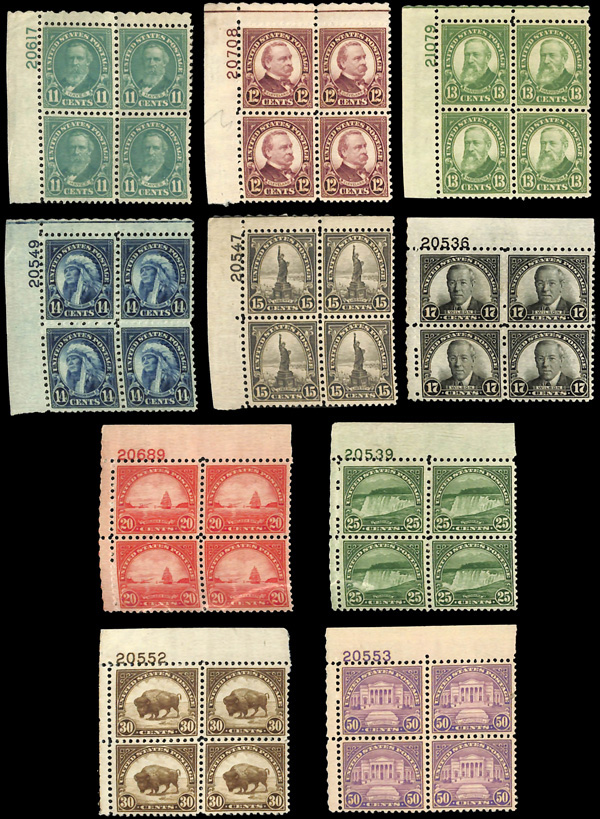 9183 nhbl 692-701 image1931, Rotary press definitives, 11¢ to 50¢ complete (Scott 692-701), set of 10, plate blocks of 4, o.g., never hinged, Very Fine to Extremely Fine.
