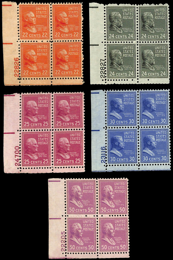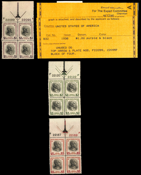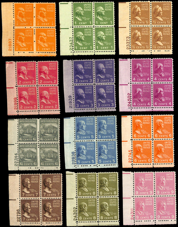 9196 nhbl 803-834 image1938, Presidential Issue, ½¢ to $5 complete (Scott 803-834), set of 32, plate blocks of 4, o.g., never hinged, Very Fine to Extremely Fine, $1 #832 with 1992 P.F. certificate.