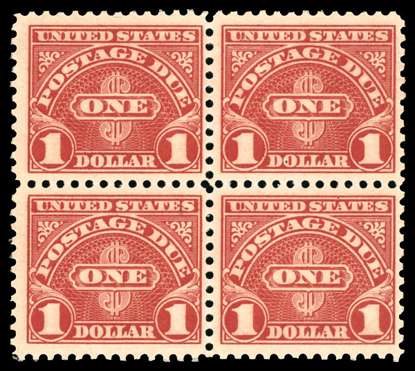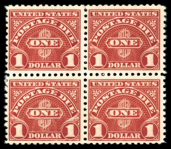 9259 nhbl J77a imagePostage Due, 1930, $1 scarlet (Scott J77a), block of 4, o.g., never hinged (2 stamps with gum skips), Fine to Very Fine.