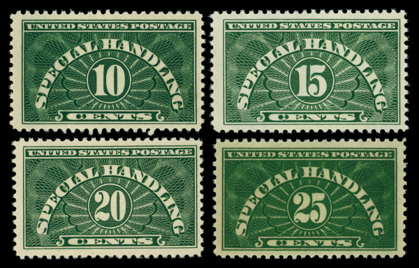 9266 nh QE1-QE4 imageSpecial Handling, 1925-28, 10¢ to 25¢ complete (Scott QE1-QE4), o.g., never hinged, Very Fine.