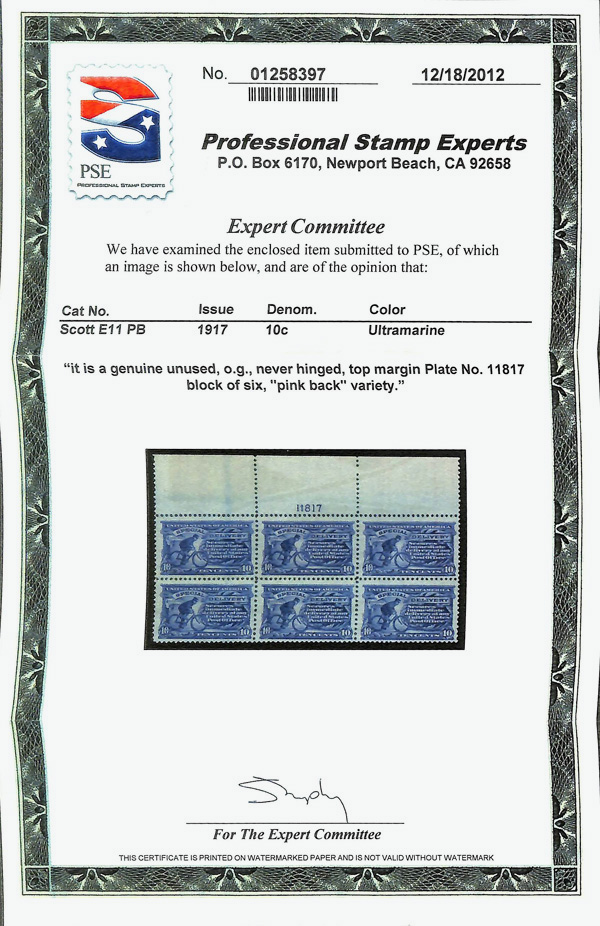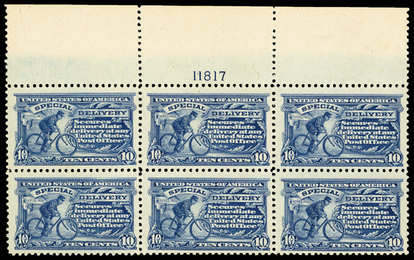 9250 nhbl E11 imageSpecial Delivery, 1917, 10¢ ultramarine, "pink back" variety (Scott E11 var.), top margin plate block of 6, very scarce variety that Scott Catalogue mentions is worth four times the value of a normal plate block, o.g., never hinged, Fine to Very Fine, with 2012 P.S.E. certificate.