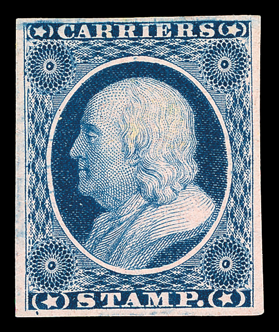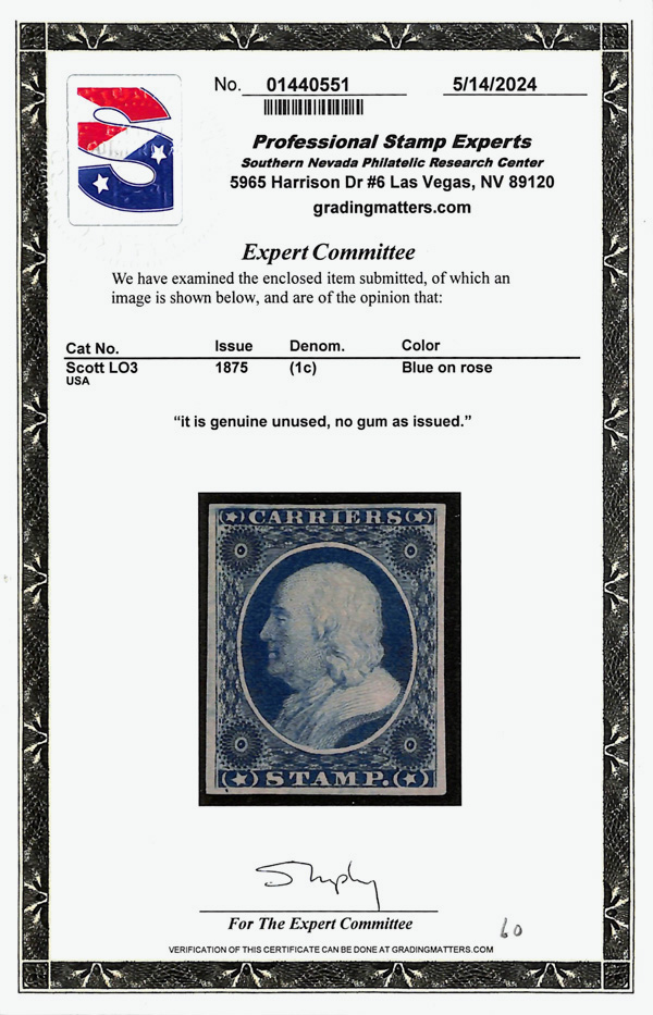 9273 ng LO3 image1875, Franklin blue on rose paper (Scott LO3), single, without gum as issued, Fine to Very Fine, with 2024 P.S.E. certificate.