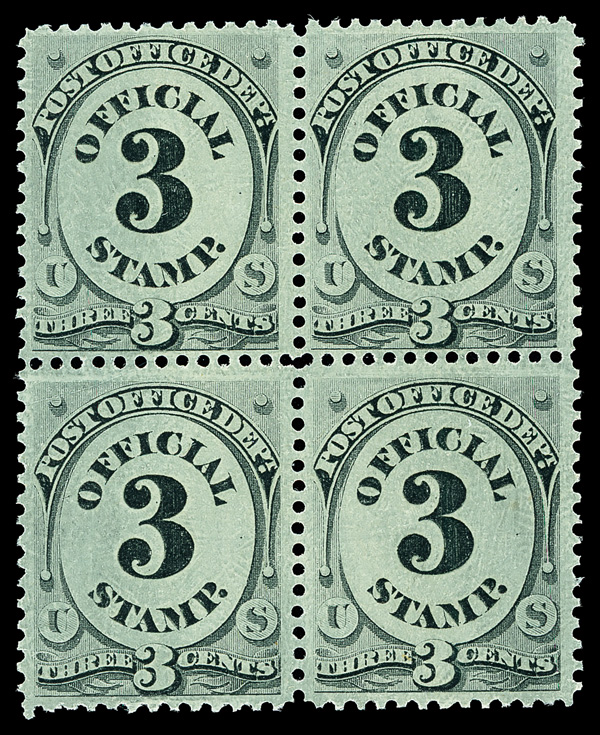9260 nhbl O49 imagePost Office Dept., 1873, 3¢ black (Scott O49), block of 4, o.g., never hinged, cleanly printed in attractive color, fresh and appealing; few gum skips on right stamps, Fine to Very Fine.