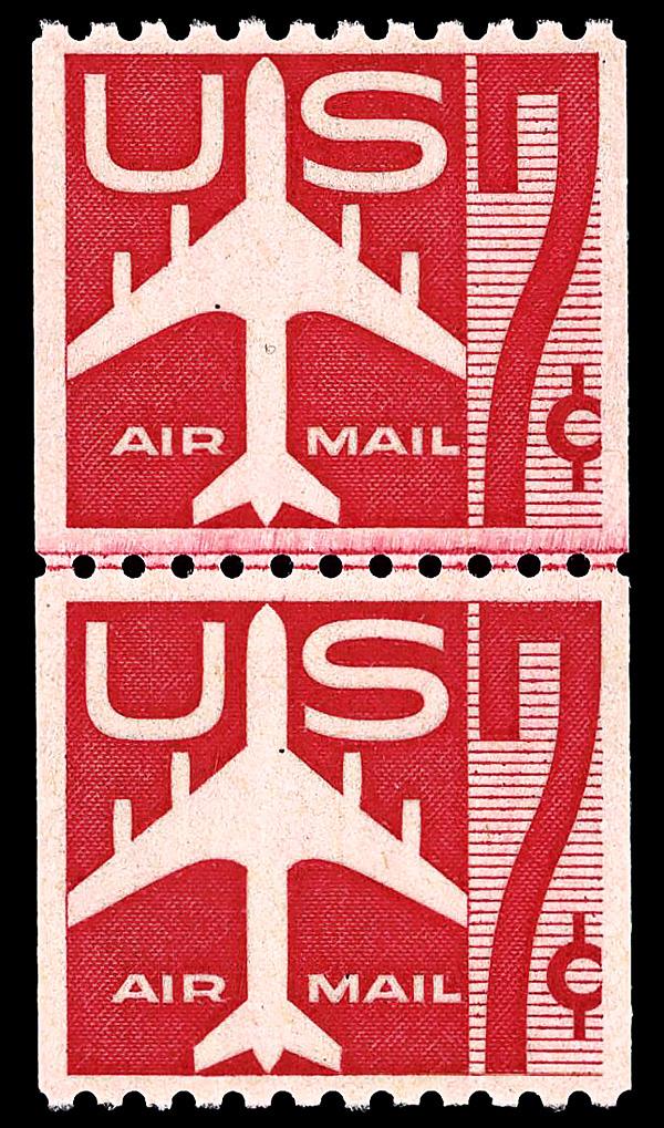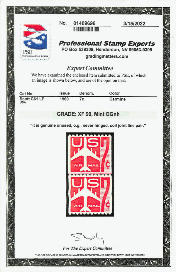 9242 nh C61 imageAirmail, 1960, 7¢ carmine Jet coil (Scott C61), line pair, Clean color with brilliance, o.g., never hinged, Extremely Fine, with 2022 P.S.E. certificate graded XF 90.