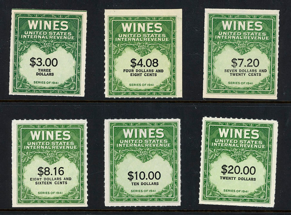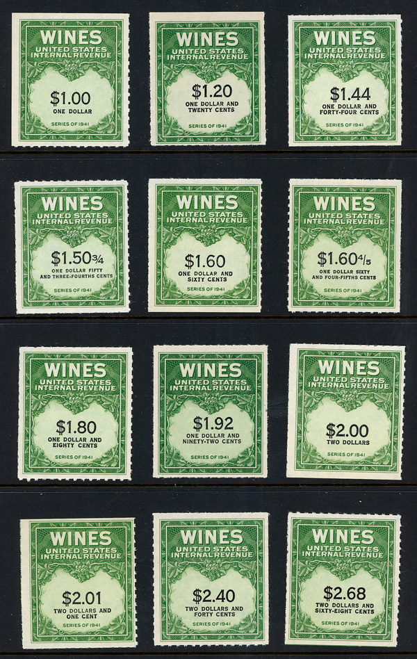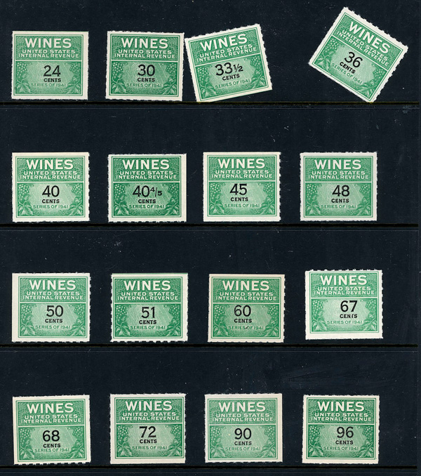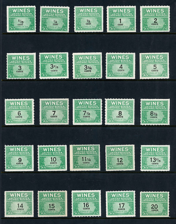 9282 ng RE108//RE203 imageWine Stamps, 1942-54, 1/5¢-$20.00 (Scott RE108//RE203), selection of 59 different, without gum as issued, Fine to Very Fine.