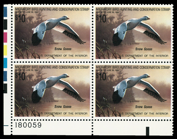 9303 nhbl RW55 imageFederal Duck Stamp, 1988, $10 Snow Geese (Scott RW55), plate block of 4, o.g., never hinged, Extremely Fine to Superb.