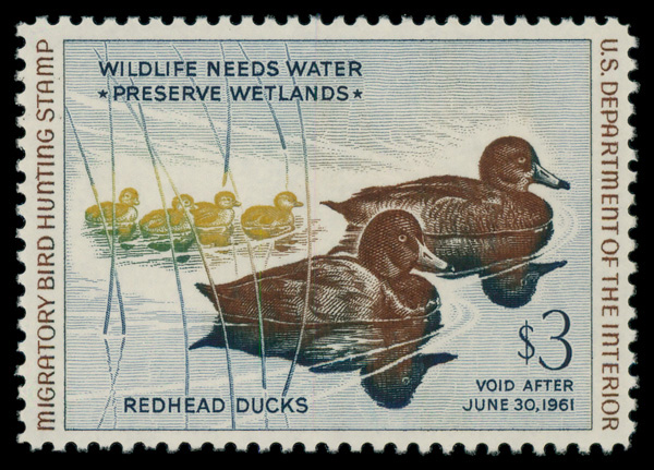 9294 nh RW27 imageFederal Duck Stamp, 1960, $3 Redhead Ducks (Scott RW27), o.g., never hinged, Extremely Fine.