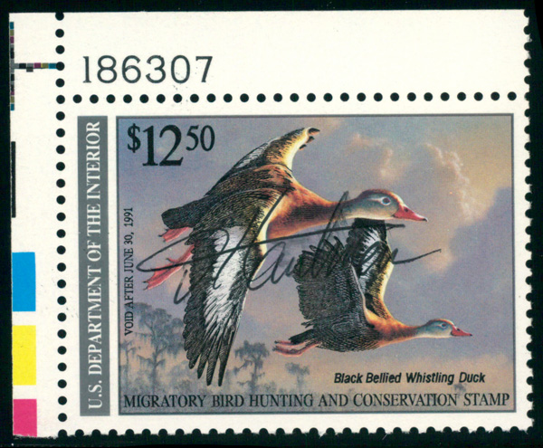 9305 nh RW57 imageFederal Duck Stamp, 1990, $12.50 Whistling Duck (Scott RW57), plate number single, artist signed, o.g., never hinged, Extremely Fine to Superb. (Image) Suggested Bid $14