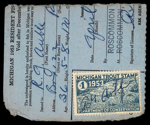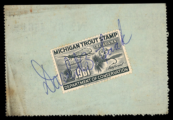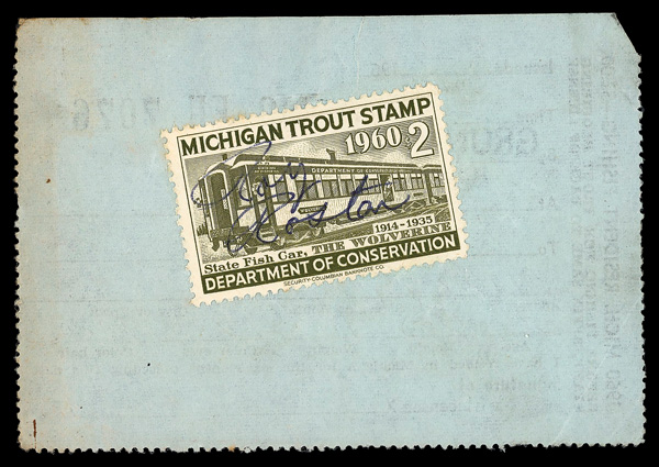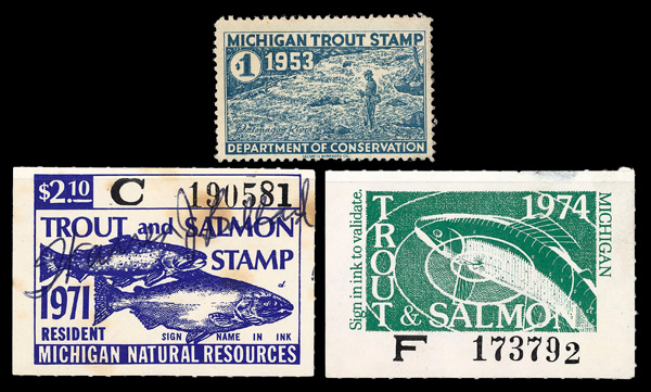 9320 og/O MIT6-14 image1953-74, Michigan Trout & Salmon stamps, lot of 6, some on document pieces, Very Fine.