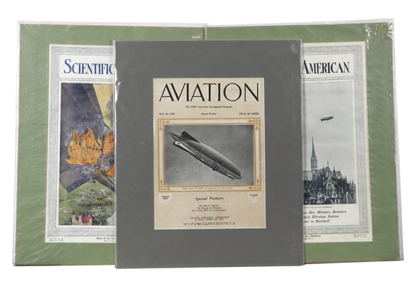 9345 ephemera imageUnited States Magazine Covers, Scientific American matted cover showing German military parsevals passing the Cologne cathedral, color matted cover from Scientific American showing airplane attacking a Zeppelin, matted Aviation magazine cover of airship Italia commanded by Gen Umberto Nobile, reproduction of a 1935 Air-Ship Day poster as part of Michigan football, and 1883 woodcut of Tissandier aerostat; attractive. Shipping charges apply - weight 5 lbs. (Image) Suggested Bid $8