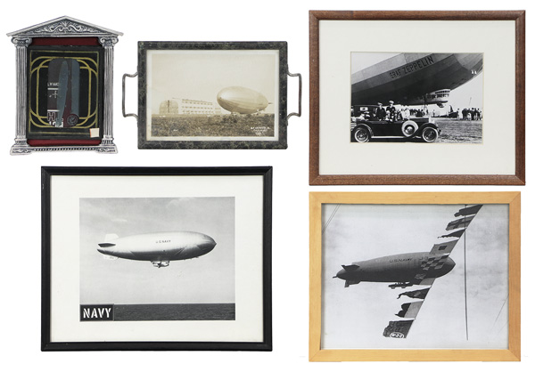 9347 photos imageVaried. American, German, and British Airships in Flight, five items illustrating airships; glass plate (4" x 3") of British R43 produced by The Childrens Encyclopedia with desktop metal frame; 6" x 4.5" vintage (copyright 1928) photographic print in a serving tray-like frame showing an early US Navy airship outside a hanger; 8" x 10" modern print in light color wood frame of the US Navy J-3 passing over a series of pennants; 6.5" x 4.5" period photo matted in an attractive wood frame showing T G W Settle and party with the Graf Zeppelin at Mines Field in California; and an 8" x 10" poster print framed of the US Navy ZD-6 over open water; a nice group. Shipping charges apply - weight 5.4 lbs. (Image) Suggested Bid $22