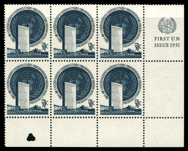 9333 nhbl 10 image1951, 50¢ indigo, 4th printing, with cloverleaf cutout LR block (Scott 10), inscription block of 6, o.g., never hinged, Extremely Fine.