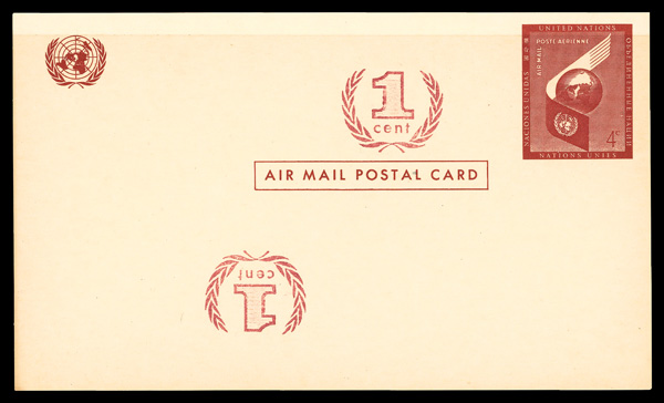 9335 og UXC2c image1959, 4¢+1¢ Globe & Emblem, double surcharge, one inverted (Scott UXC2c), o.g., never hinged, Extremely Fine.