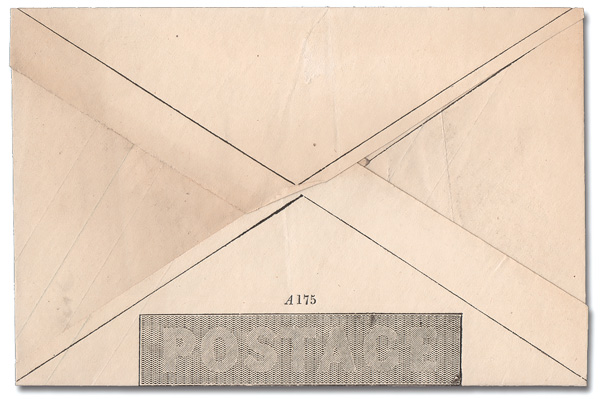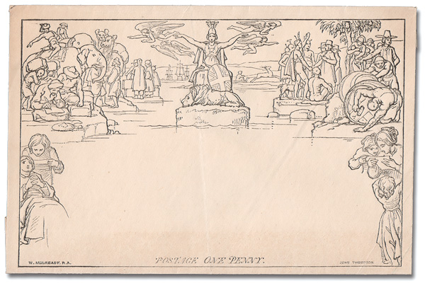 9348 ogcover U1 image1840, Mulready Envelope, 1d black (Scott U1), Stereo A175, folded "outside the lines" giving it an unusual wide border; very faint browning of the bottom edge, otherwise Very Fine.