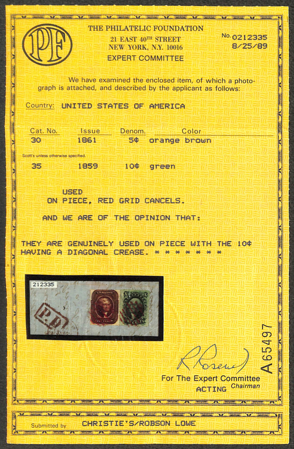 7018 O 30 image1861, 5¢ orange brown, type II (Scott 30), used on piece of folded letter with red grid cancels, 10¢ with diagonal crease, Fine to Very Fine, with 1989 P.F. certificate.