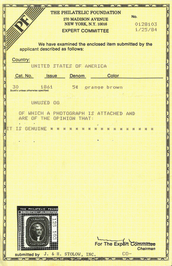 7017 og 30 image1861, 5¢ orange brown, type II (Scott 30), o.g., lightly hinged, sound and fresh with deep, rich color, clearly showing type characteristics at top and bottom, Very Fine, with 1984 P.F. certificate.