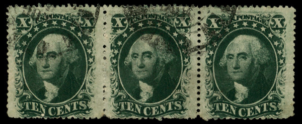 7028 Z 68 image1861, 10¢ green (Scott 68), strip of 3, Very Good to Fine.