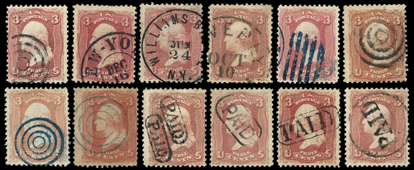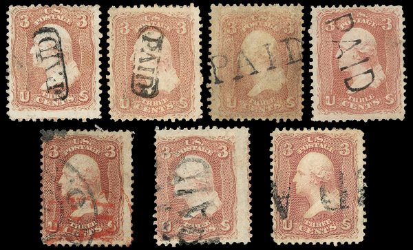 7025 O 65 image1861, 3¢ rose (Scott 65), selection of 19 examples of shades and varieties of cancel types, generally Very Fine. (Image) (Image2) (All Images)