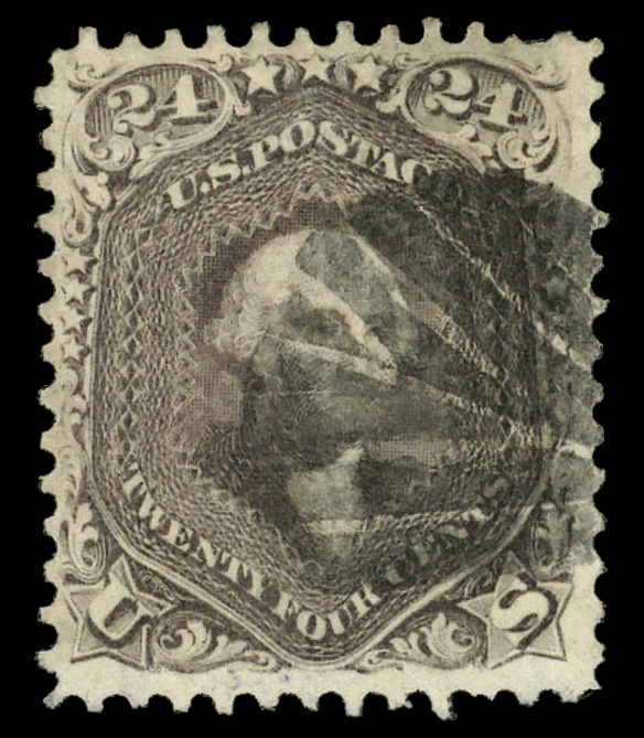 7030 O 69 image1861, 12¢ black (Scott 69), handsome centering, with a grid cancel and a red cancel; purple stains on reverse, Very Fine overall.