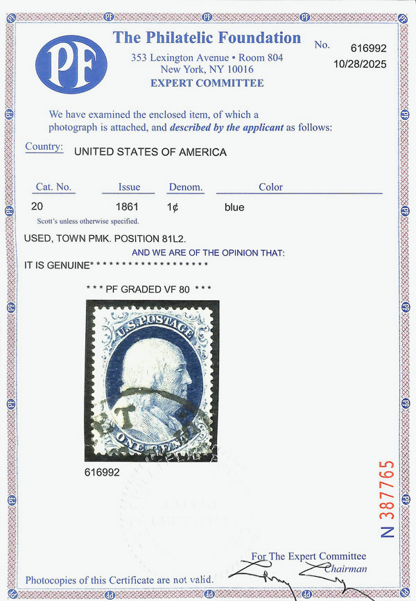 7012 O 20 image1857, 1¢ blue, type II (Scott 20), position 81L2, Post Office fresh with intense color and clean lines, nicely centered on bright paper with town postmark, Very Fine, with 2025 P.F. certificate graded VF 80.