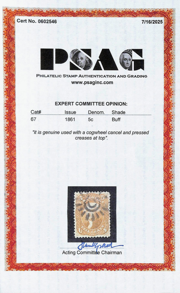 7026 O 67 image1861, 5¢ buff (Scott 67), face-fresh with rich color, clean impression and neat cogwheel cancel; pressed creases at top, still Extremely Fine appearance, with 2025 P.S.A.G. certificate.