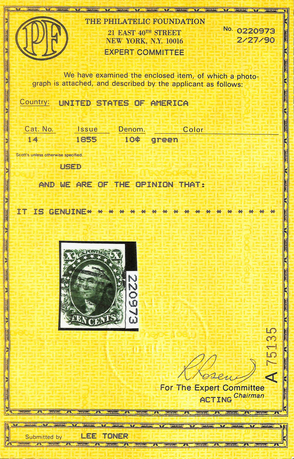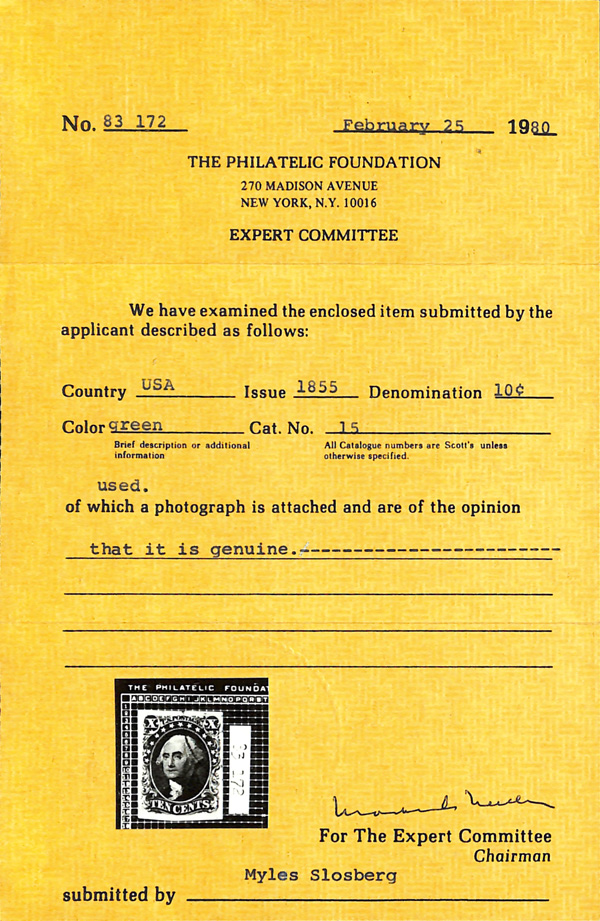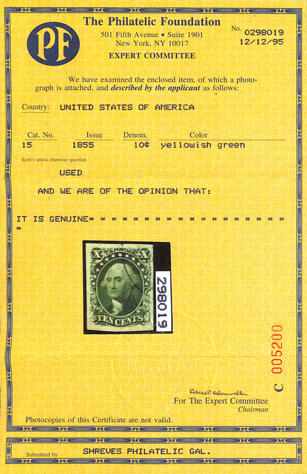 7011 O 15 image1855, 10¢ green, type III (Scott 15), Very Fine to Extremely Fine, with 1995 P.F. certificate & 1980 P.F. certificate.