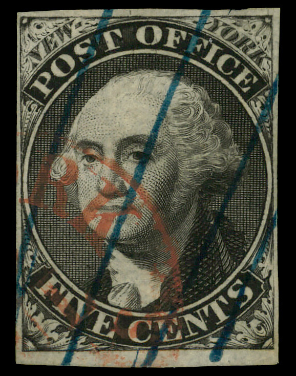 7001 O 9X1e imageNew York, N.Y., 1845, 5¢ black on bluish, without signature (Scott 9X1e), Blue pen cancel with red New York cds; LR corner crease, Fine.