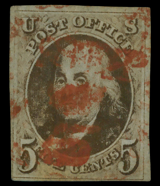 7002 O 1 image1847, 5¢ red brown (Scott 1), red cancel, Fine to Very Fine.