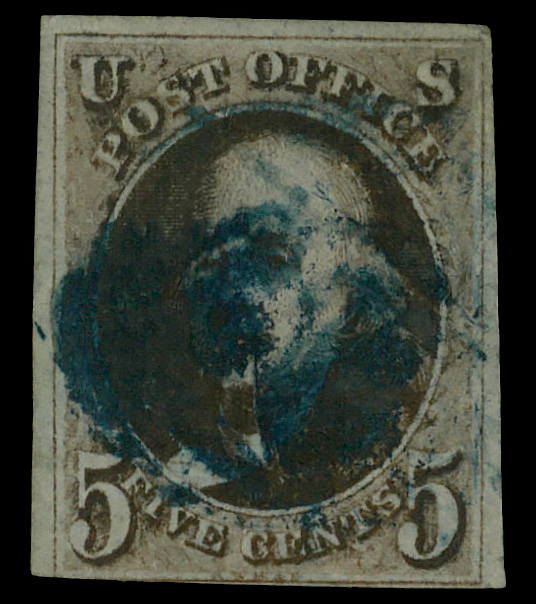 7003 O 1a image1847, 5¢ dark brown (Scott 1a), small pre-print fold middle right to top center, blue cancel, Fine.