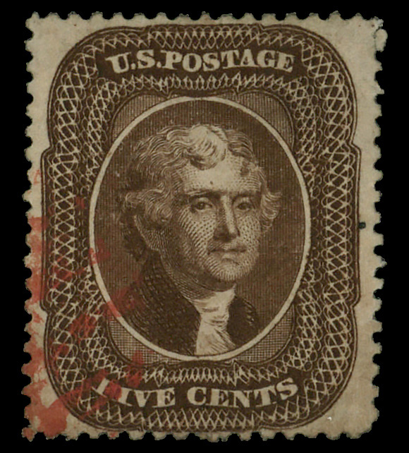 7019 O 30A image1860, 5¢ brown, type II (Scott 30A), red cancel, Fine to Very Fine.