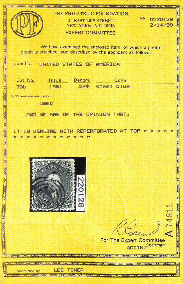 7031 O 70b image1861, 24¢ steel blue (Scott 70b), target cancel; reperfed at top, Fine to Very Fine, with 1990 P.F. certificate.