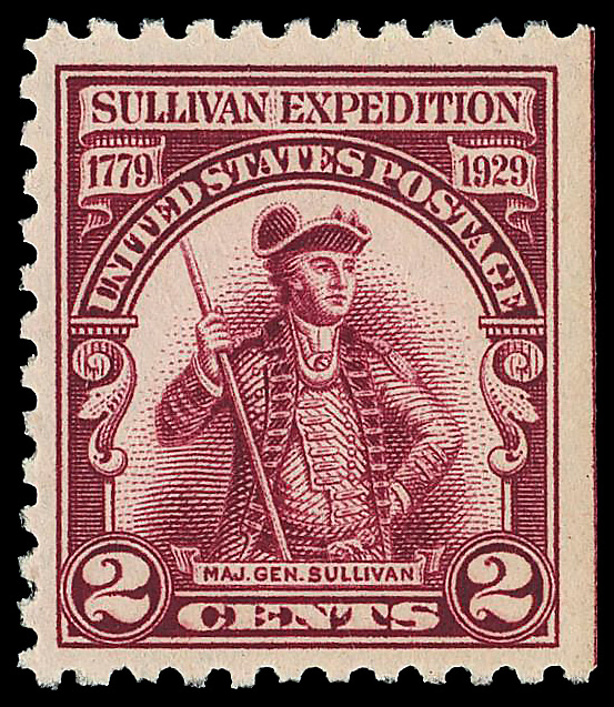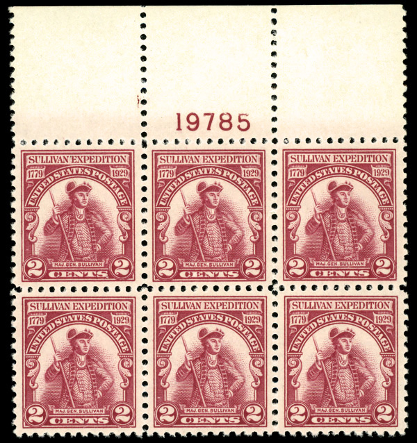 7363 nhbl 657 image1929, 2¢ Sullivan Expedition (Scott 657), plate block of 6, o.g., never hinged (gum skip), Extremely Fine.