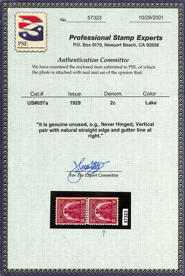 7364 nh 657a image1929, 2¢ Sullivan Expedition, lake color error (Scott 657a), right margin single with guide line, o.g., never hinged, Very Fine, with 2001 P.S.E. certificate for pair.