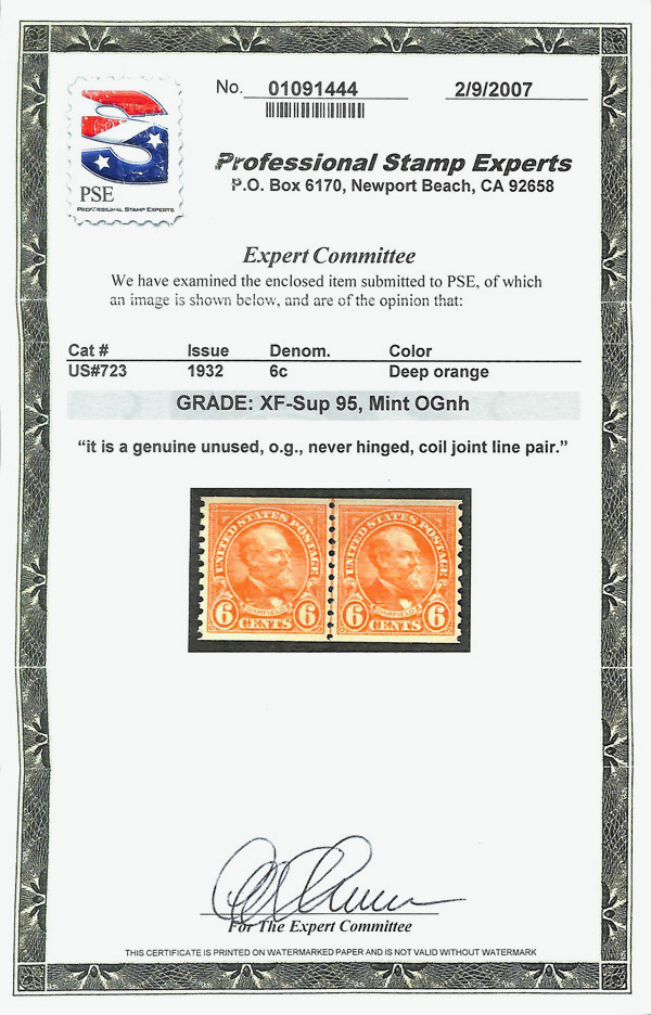 7385 nh 723 image1932, 6¢ Garfield, rotary press printing, horizontal coil (Scott 723), line pair, fresh as issued, ideally placed design, o.g., never hinged, Extremely Fine to Superb, with 2007 P.S.E. certificate graded XF-SUP 95.