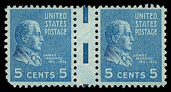 7392 nh 810 image1938, Presidential Issue, 5¢ Monroe (Scott 810 var.), horizontal pair with gutter between, o.g., never hinged, clean and bright; left stamp with bottom left corner clipped, otherwise Fine to Very Fine, with 2017 P.S.E. certificate.
