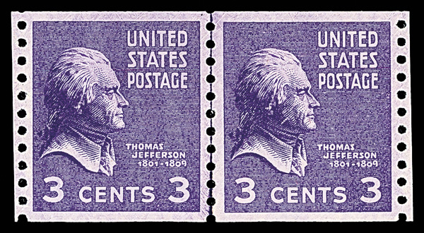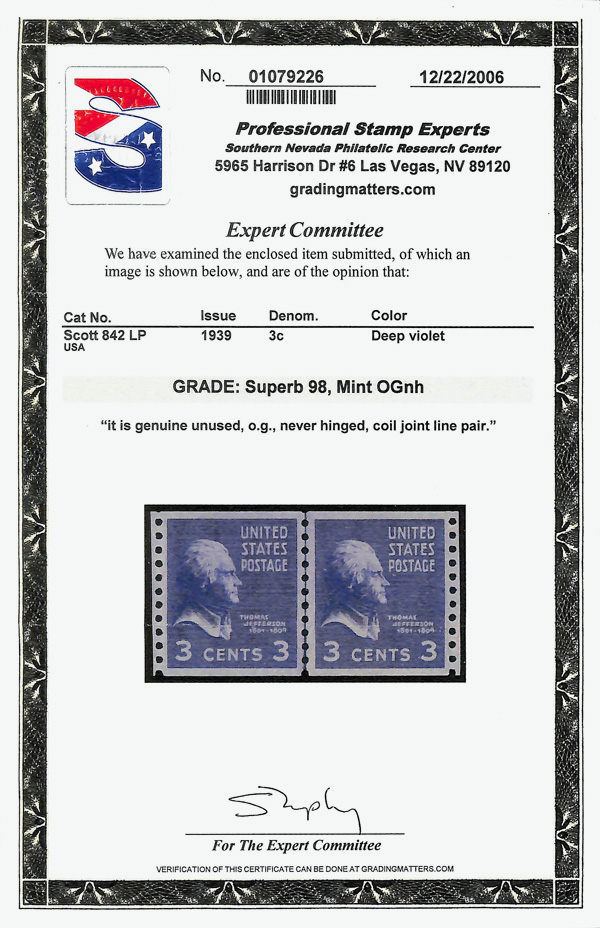 7399 nh 842 image1939, Presidential Issue, 3¢ Jefferson, horizontal coil, perf. 10 vertically (Scott 842), line pair, bright and balanced, o.g., never hinged, Superb, with 2006 P.S.E. certificate graded SUP 98.